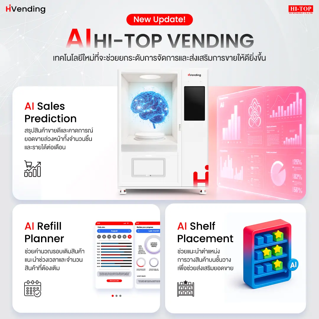 บริษัท Hi-Top Technology พร้อมเปิดประสบการณ์ใหม่ให้กับธุรกิจตู้จำหน่ายสินค้าอัตโนมัติ ด้วยการเปิดตัว ฟีเจอร์ AI อัจฉริยะครั้งแรกในประเทศไทย ที่จะช่วยยกระดับการจัดการและเพิ่มโอกาสการขายให้ดียิ่งขึ้น