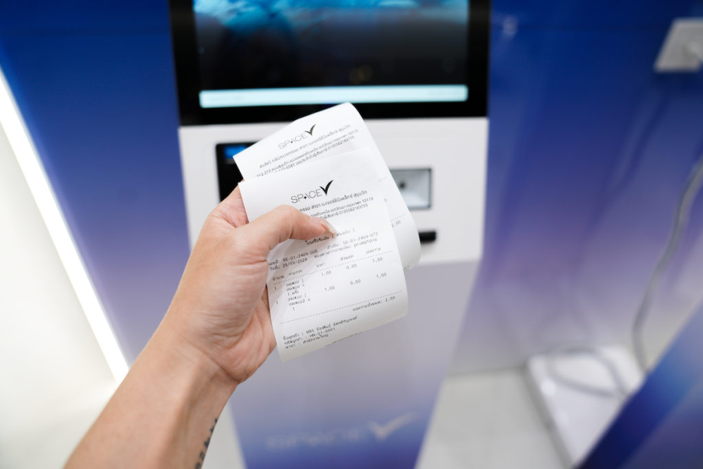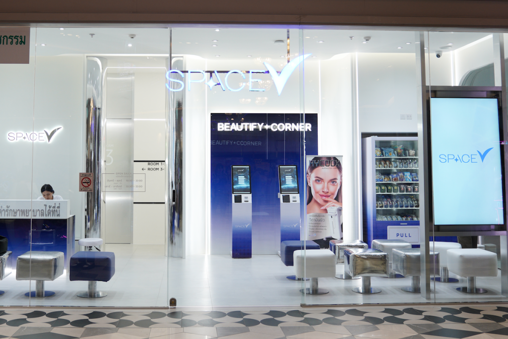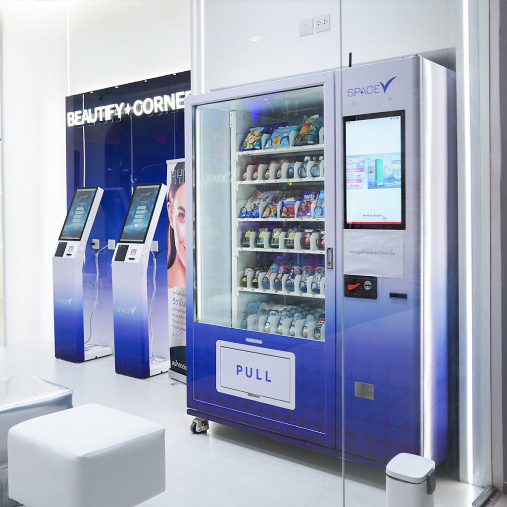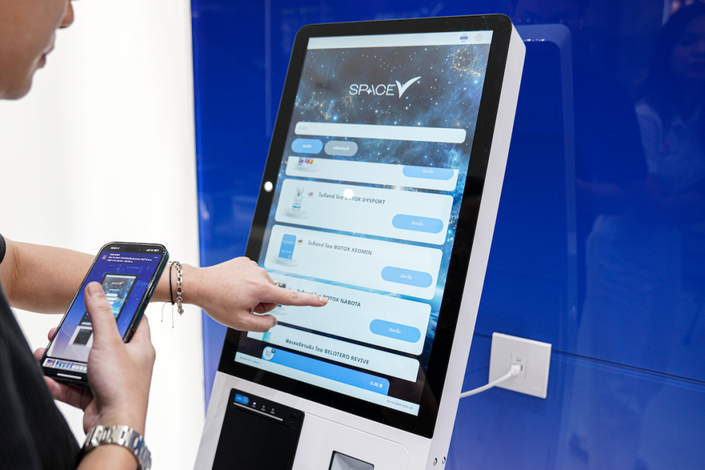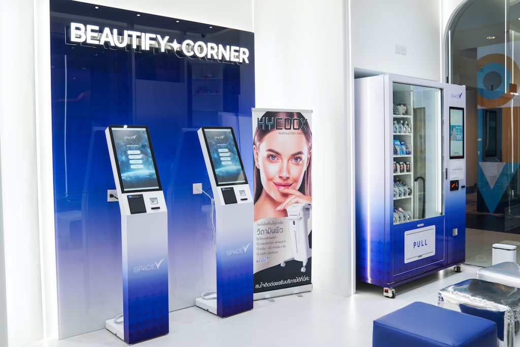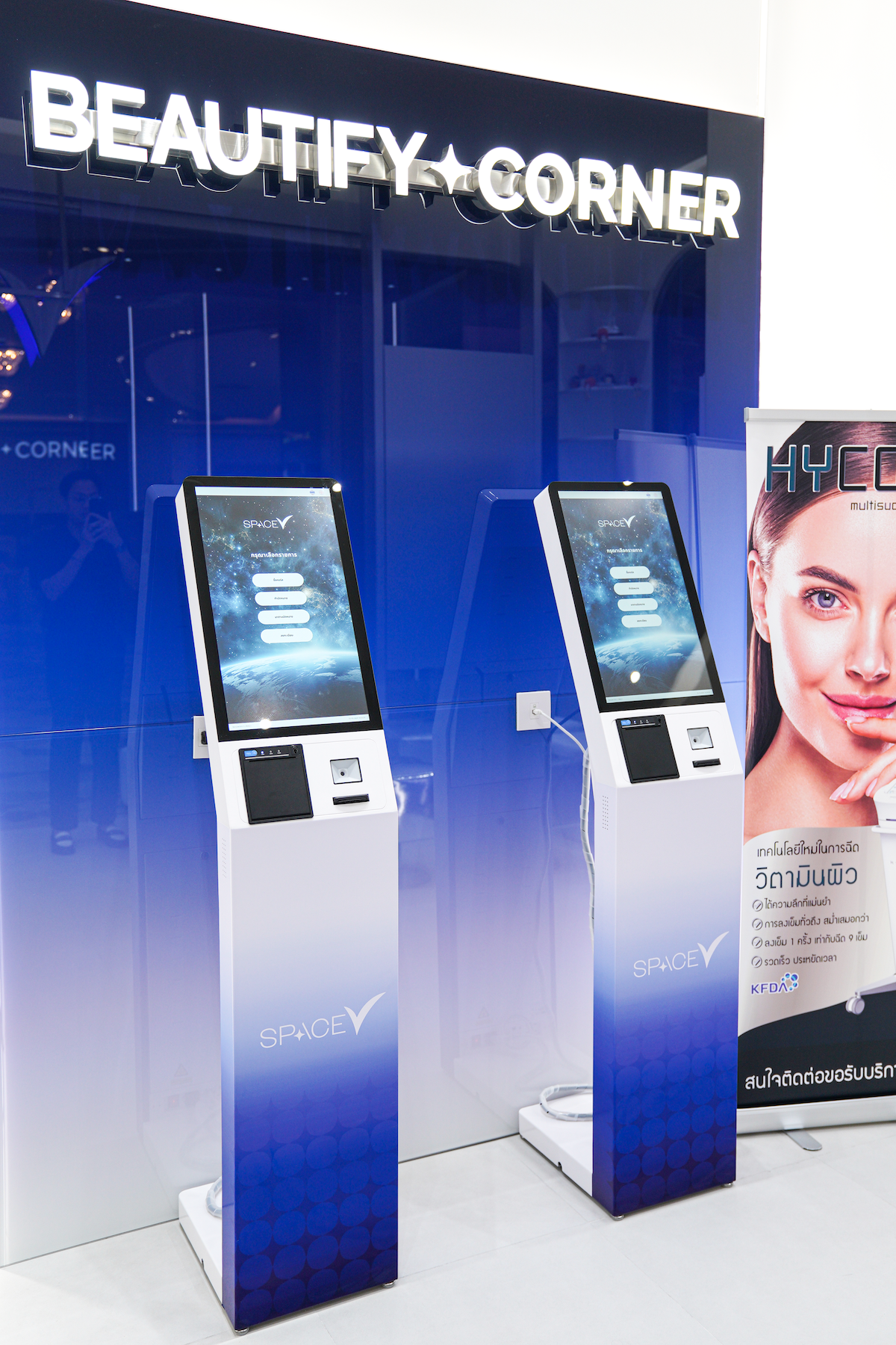 ตู้คีออสซื้อคอร์สความงาม คลินิก Space V ผลิตตู้คีออสจำนวน 2 ตู้ สำหรับให้ลูกค้าของคลินิกที่เข้ามารับบริการ สามารถเลือกซื้อคอร์สผ่านหน้าจอและชำระเงินได้เลย และมีการติดตั้งตู้จำหน่ายสินค้าอัตโนมัติด้านข้าง สำหรับบริหารลูกค้าที่มานั่งรอคิวและลูกค้าที่ได้รับคูปองหรือบัตรกำนัล สำหรับไปรับสินค้าที่ตู้ได้